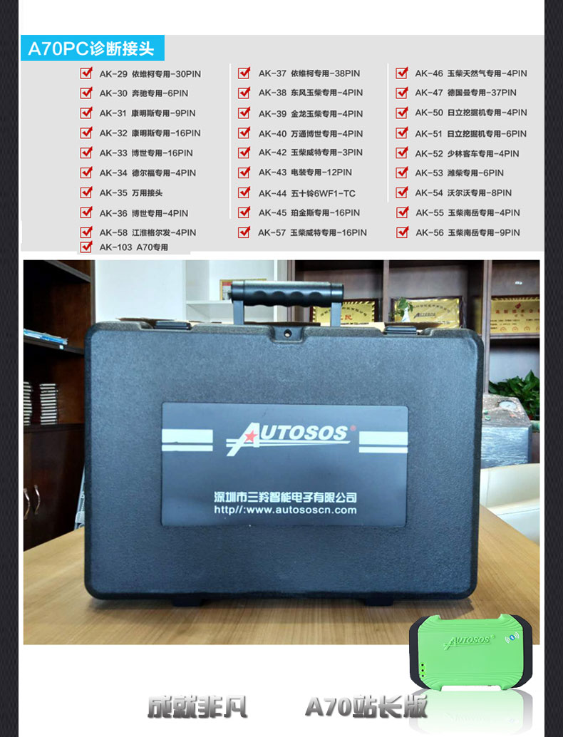 柴油測神A70站長版解碼器是深圳三羚公司根據(jù)市場需求為社會維修廠提供的一款基于技術(shù)服務支持的綜合性汽車電腦診斷儀,也是一款綜合性工程機械診斷儀,支持手機版診斷儀,擁有國六DPF高溫再生和SCR后處理試驗臺功能,旨在解決商用車后市場技術(shù)需要提升的維修廠,深圳三羚公司汽車電腦診斷儀十五年堅持自主研發(fā),先后榮獲慧聰網(wǎng)商用車十佳售后服務企業(yè),內(nèi)燃機行業(yè)協(xié)會授予的商用車售后服務貢獻獎,從第一臺手持式A30C柴油車解碼器到測神30PC柴油車解碼器再到測神A60PC柴油車解碼器,到測神A70PC站長版柴油解碼器,一直以檢測精準,測試全面,技術(shù)精湛,服務至上的經(jīng)營理念深受廣大維修人員推崇,迄今為止有三千多家柴油測神A70站長版解碼器用戶加盟三羚服務站,成為當?shù)貐^(qū)域汽修龍頭中堅力量,因其過硬的技術(shù)讓主機廠家主動為其設立服務站,為國家汽車后市場努力奉獻。